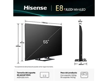 TV Mini LED 55″ – Hisense 55E8Q, UHD 4K, 144 Hz, Hi-View Engine, Escalador HDR IA, Subwoofer integrado, Negro 489.00 €