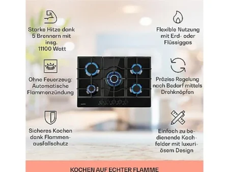 Placa de gas – KLARSTEIN Illuminosa 5, 5 zonas, 76 cm, Negro 306.00 €