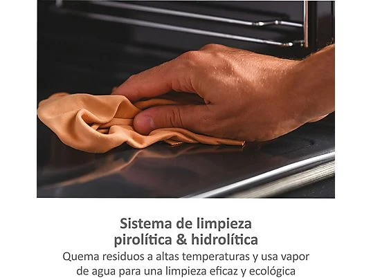 El sistema de limpieza pirolítica e hidrolítica permite mantener el horno impecable sin usar productos químicos. La pirolisis desintegra residuos difíciles elevando la temperatura, mientras que la hidrolisis facilita la limpieza diaria con la ayuda del vapor.