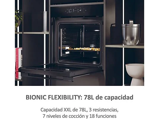 Con 18 funciones de cocción y tres resistencias, este modelo permite una cocción uniforme adaptada a todo tipo de platos. La cocción multinivel y la ventilación backtraversa garantizan resultados homogéneos en todos los niveles del horno.