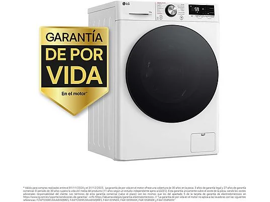 Válido para compras realizadas entre el 01/11/2024 y el 31/12/2025. La garantía de por vida en el motor ofrece una cobertura de 30 años en la pieza: 3 años de garantía legal y 27 años de garantía comercial, presidiendo el 30 años supera la vida útil media del producto (11 años según un estudio independiente ajeno a LGEES). Esta garantía únicamente cubre el coste de la pieza, siendo los costes adicionales responsabilidad del cliente. Los términos de esta garantía comercial (30 años) son los mismos que los de la garantía de grandes electrodomésticos en https://www.lg.com/es/support/condiciones-de-garantia/