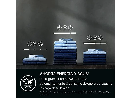 PreciseLoad adapta automáticamente la duración del ciclo, además del consumo de agua y energía, en proporción al volumen de carga de la colada. De este modo, se consiguen ciclos de lavado personalizados que reducen el consumo de agua y energía al lavar y secar cargas pequeñas.