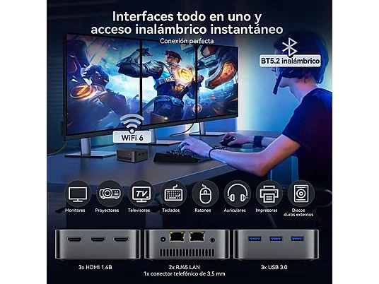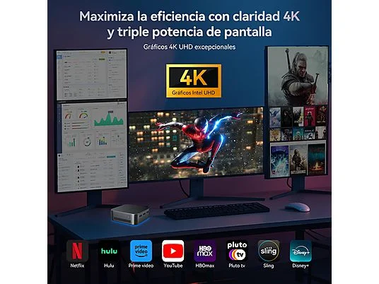 • 【Soporte para triple monitor 4K UHD】 El Mini PC soporta salida 4K UHD con una resolución máxima de 4096×2304@60Hz. Tres puertos HDMI 1.4b permiten una visualización en tres pantallas, dándote más espacio para trabajar y aumentando la productividad. Ya sea que edites videos, juegues o realices múltiples tareas, el Huidun H20 ofrece una experiencia envolvente que mejora tanto el entretenimiento como la productividad