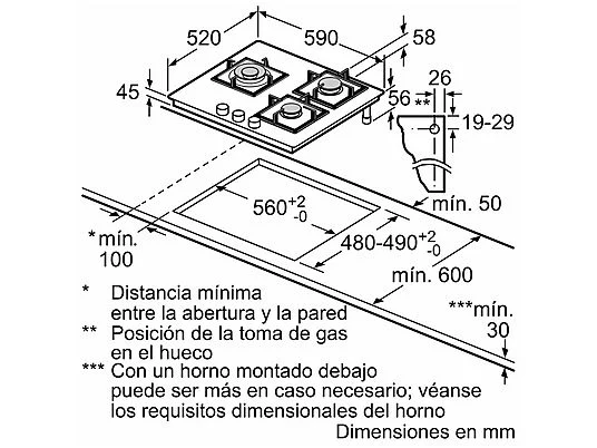Placa de gas – Bosch PPC6A6I10, 3 zonas, Ancho 59 cm, Gas natural, Vidrio templado, Negro