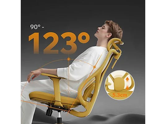 La silla está equipada con un soporte lumbar con un ajuste de 5,3 cm que permite adaptar el cojín a donde tu espalda necesita apoyo. El reposacabezas permite un ajuste de altura de 8,6 cm. Además, la silla de oficina Sense7 Moyo permite una inclinación del respaldo en 3 niveles, de 90° a 123°.