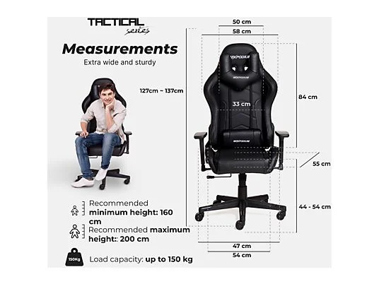 Silla gaming – MAXPODIUM Tactical SMI, reposabrazos 3D (ajustable en altura, anchura y profundidad), hasta 150 kg, Negra